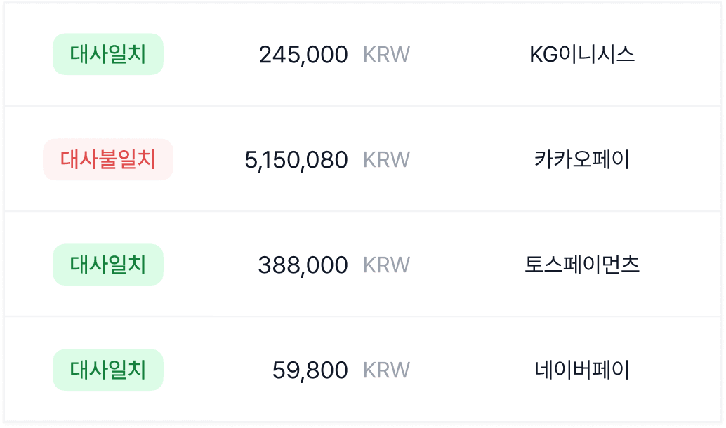 거래대사를 통해 고객사 주문정보와 PG사 결제정보를 비교/대조할 수 있습니다.